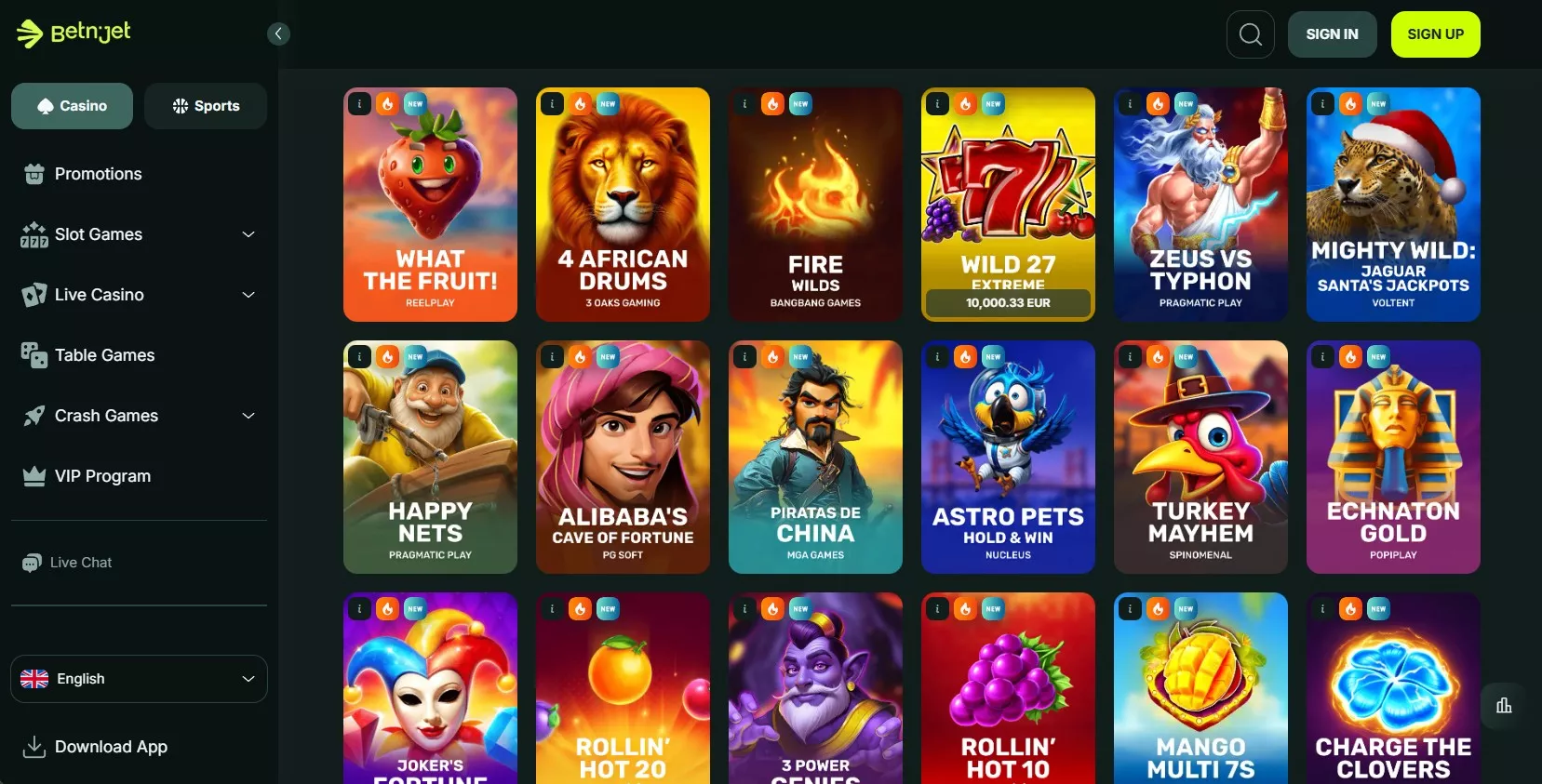 Betnjet casinospellen tellen meer dan 12.300 titels van 150+ software providers. De bibliotheek omvat alle populaire genres: klassieke en video gokautomaten, tafelspellen met verschillende inzetlimieten, live casino met professionele dealers, crash games en megaways slots met duizenden uitbetalingslijnen. Het platform vult de catalogus regelmatig aan met nieuwe releases, die verschijnen in de New Games sectie direct na de officiële lancering door ontwikkelstudio’s.