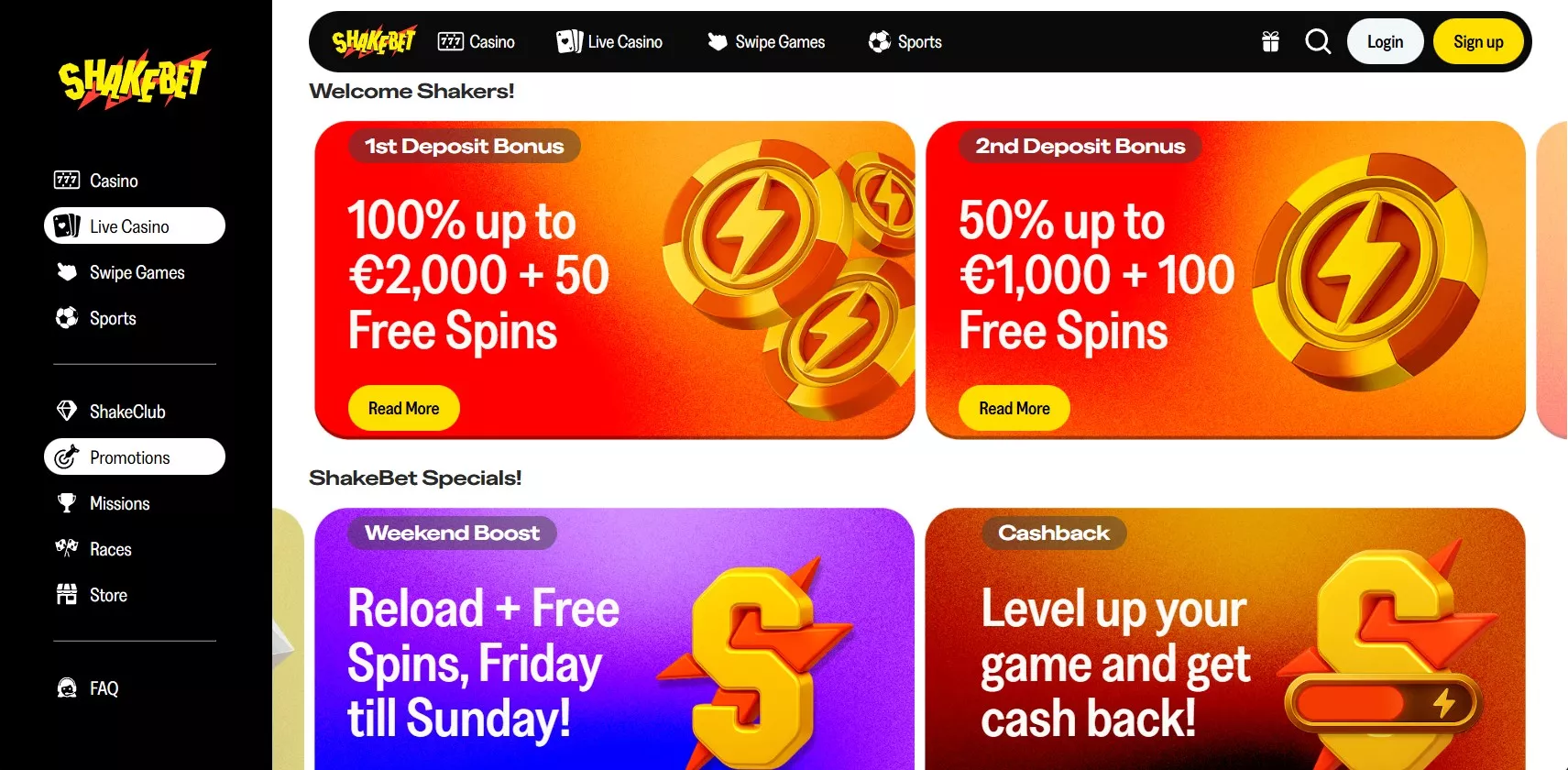 Voor sportliefhebbers is er een vrijdag freebet van €5 op een accumulator. Het weekend brengt reload-bonussen en op maandag vindt de klant een Lootbox met een verrassing. Het ShakeBet-wiel opent nieuwe sectoren met waardevolle prijzen naarmate het niveau stijgt.